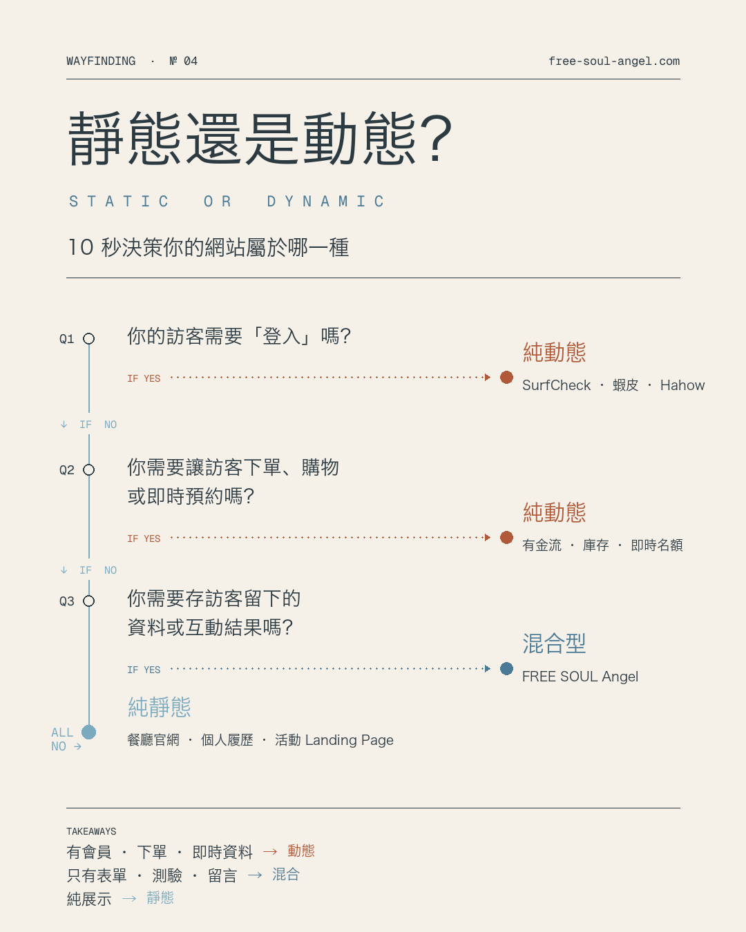 🔄 混合型(櫥窗 + 一點互動) 主要是展示,但有一兩個地方需要跟伺服器互動(表單、測驗、資料查詢)。 例子:我的 free-soul-angel.com——大部分是介紹服務、峇里島指南、Notion 模板,但有一個「衝浪測驗」會把結果寫進我的 Notion 資料庫。