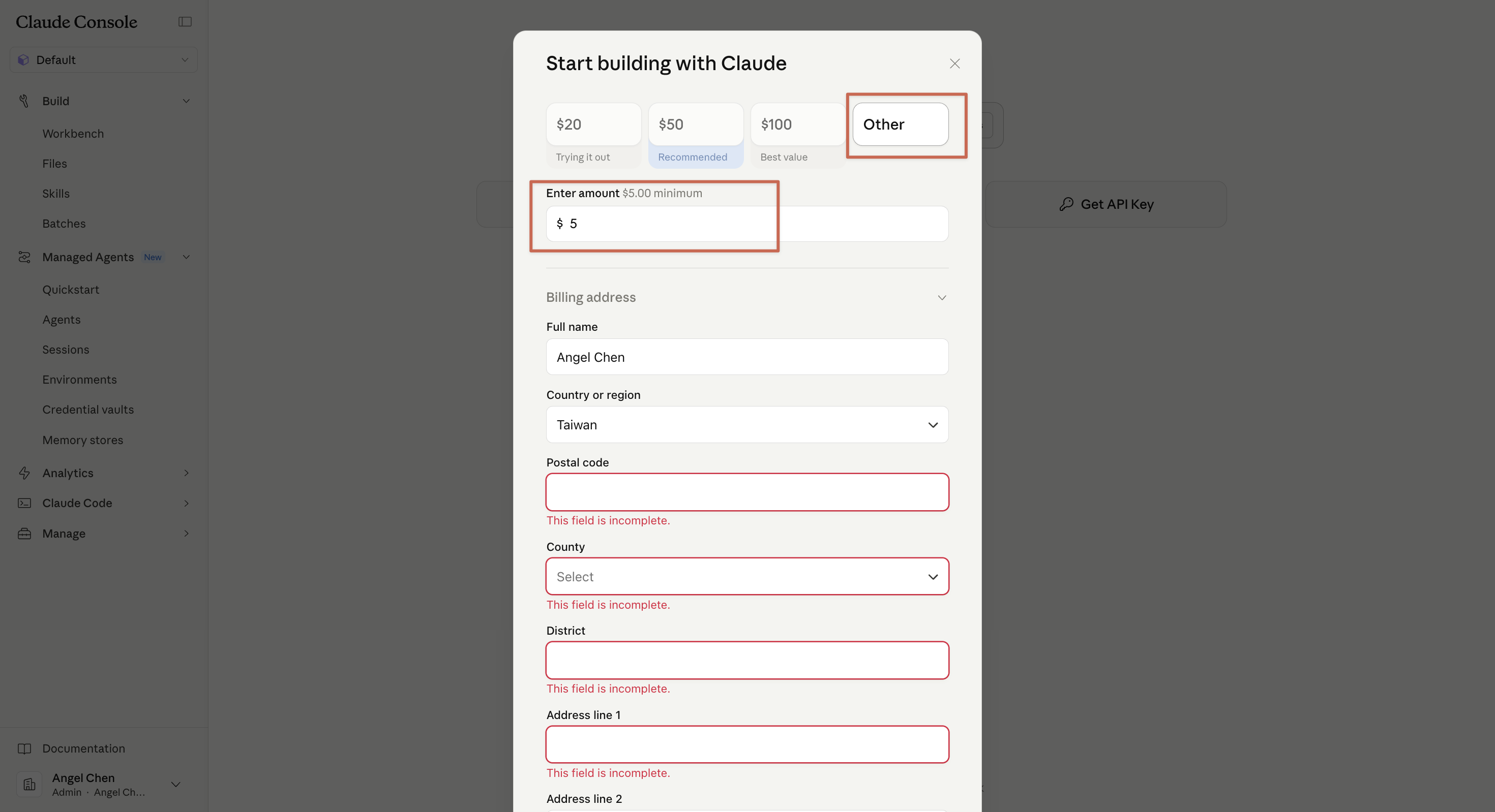 最低儲值是 $5,所以輸入 5 就好。接著綁信用卡,把該填的資訊填一填。