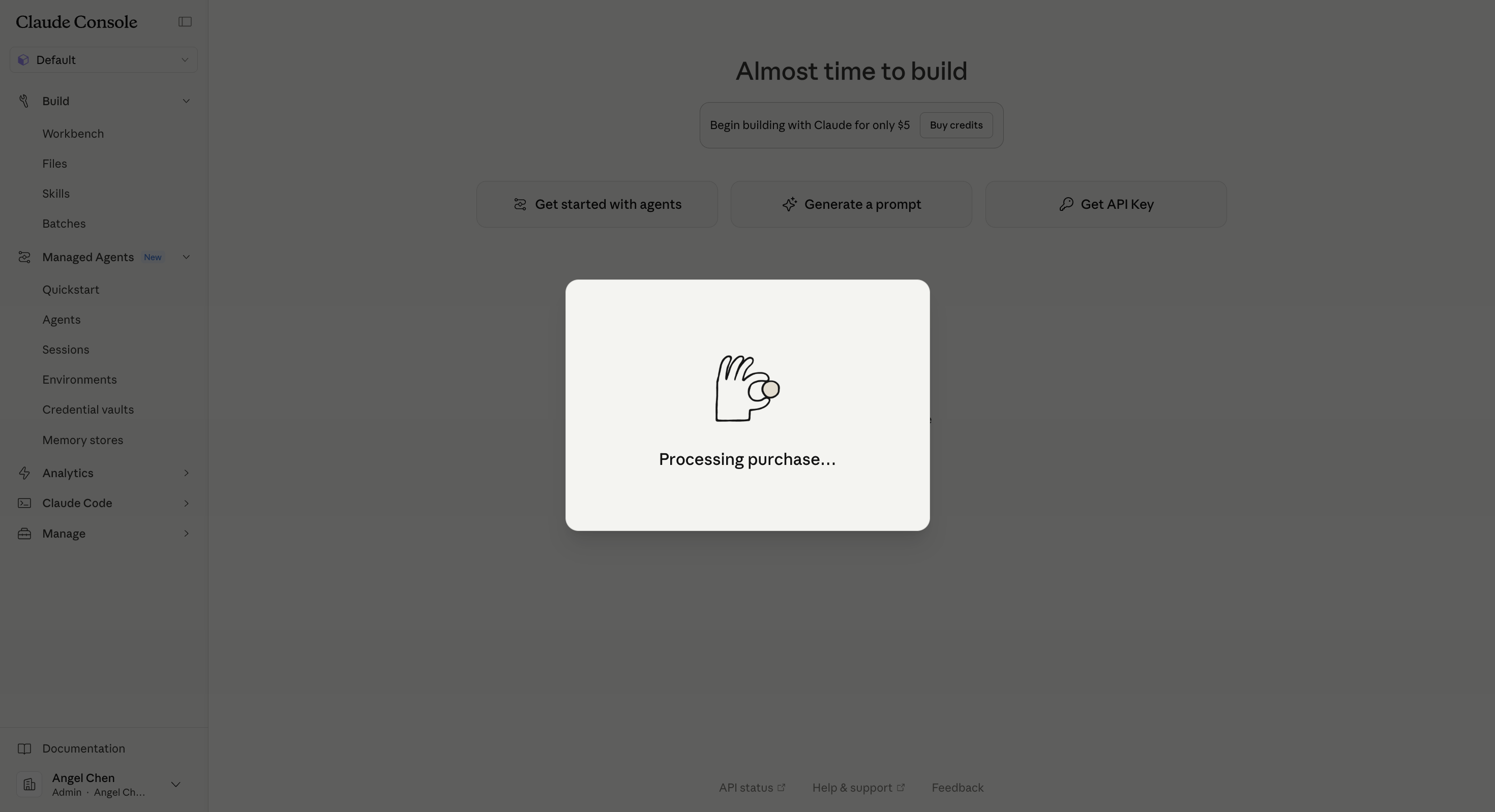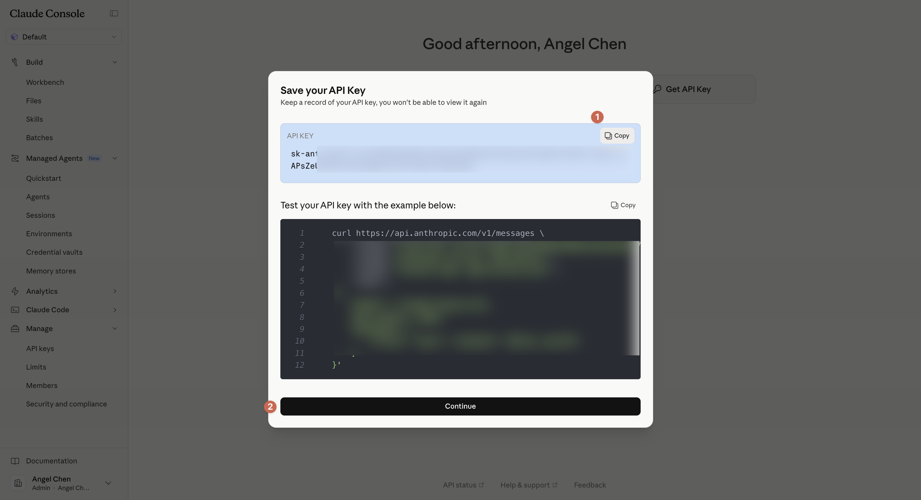 ⚠️ Claude 的 API key 只會顯示這一次。 一定要按 Copy,把 key 存進密碼管理器,然後再按 Continue → Manage API Keys。