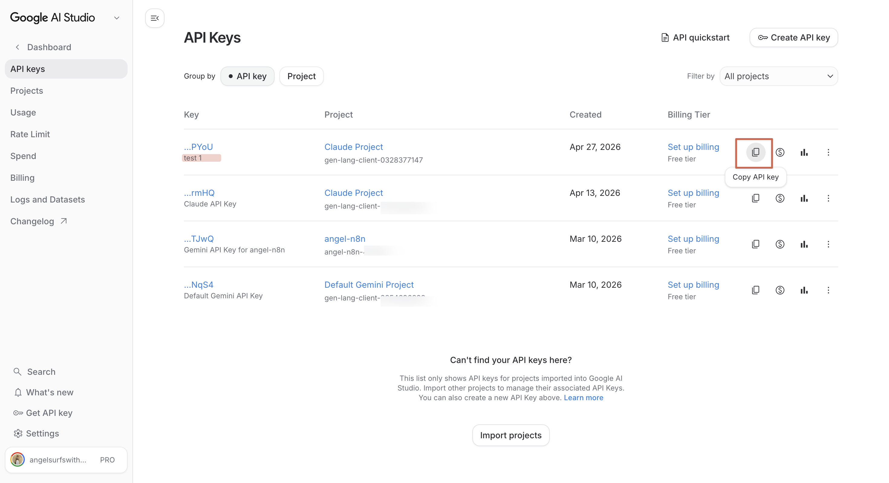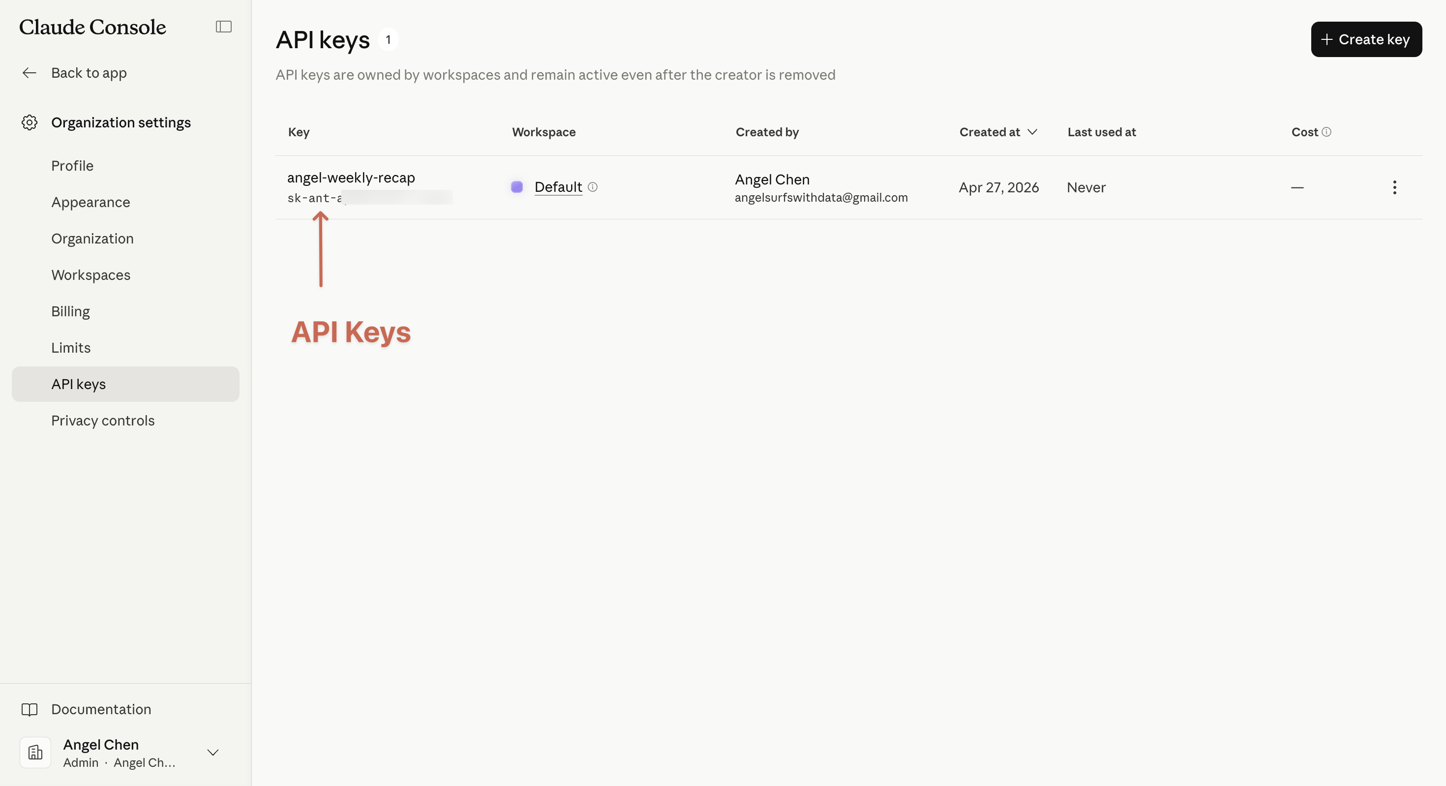 回到 API Keys 列表,會看到你剛剛建立的 key: