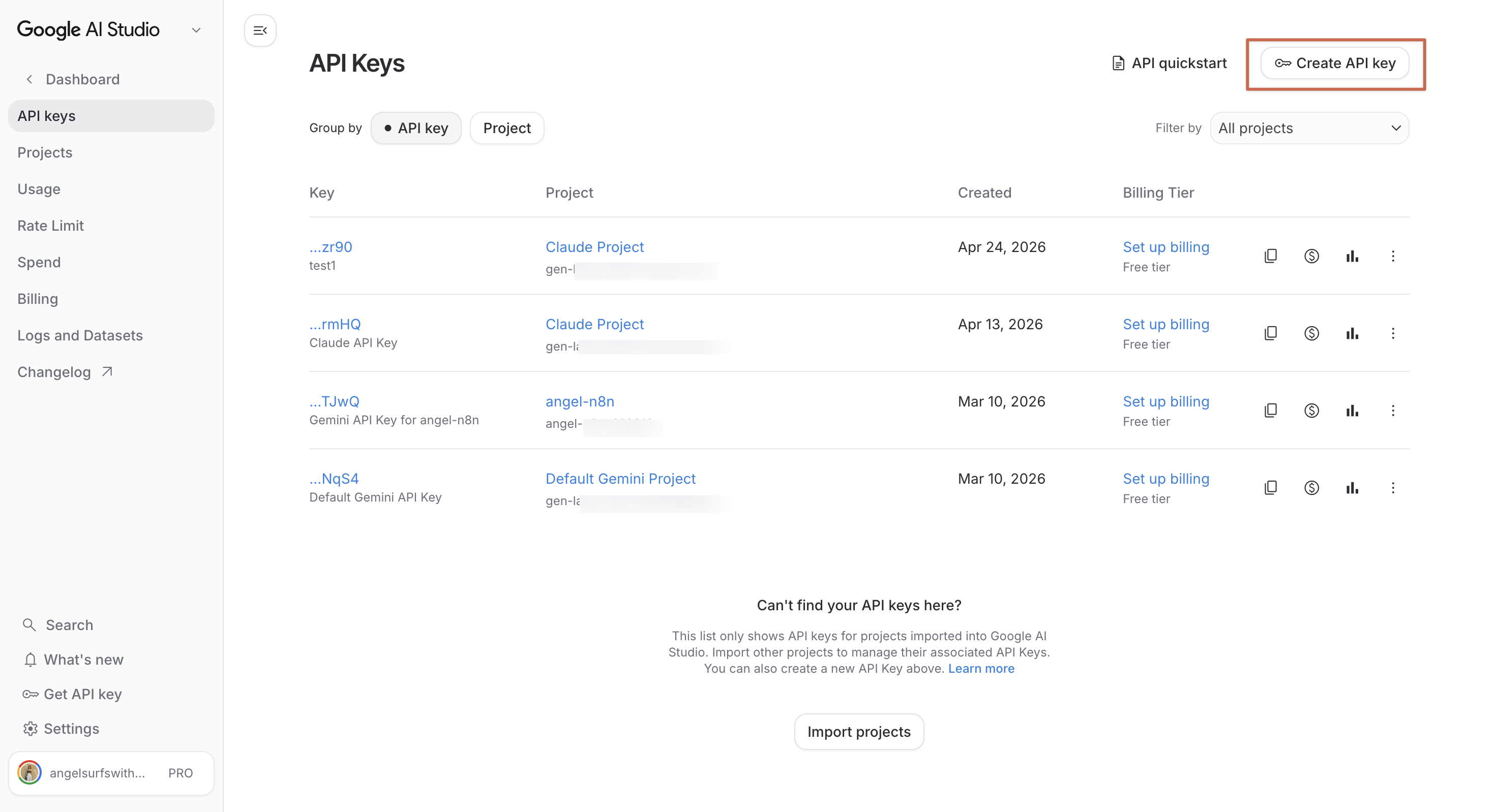右上角會有一顆「+ Create API key」按鈕,點下去。
