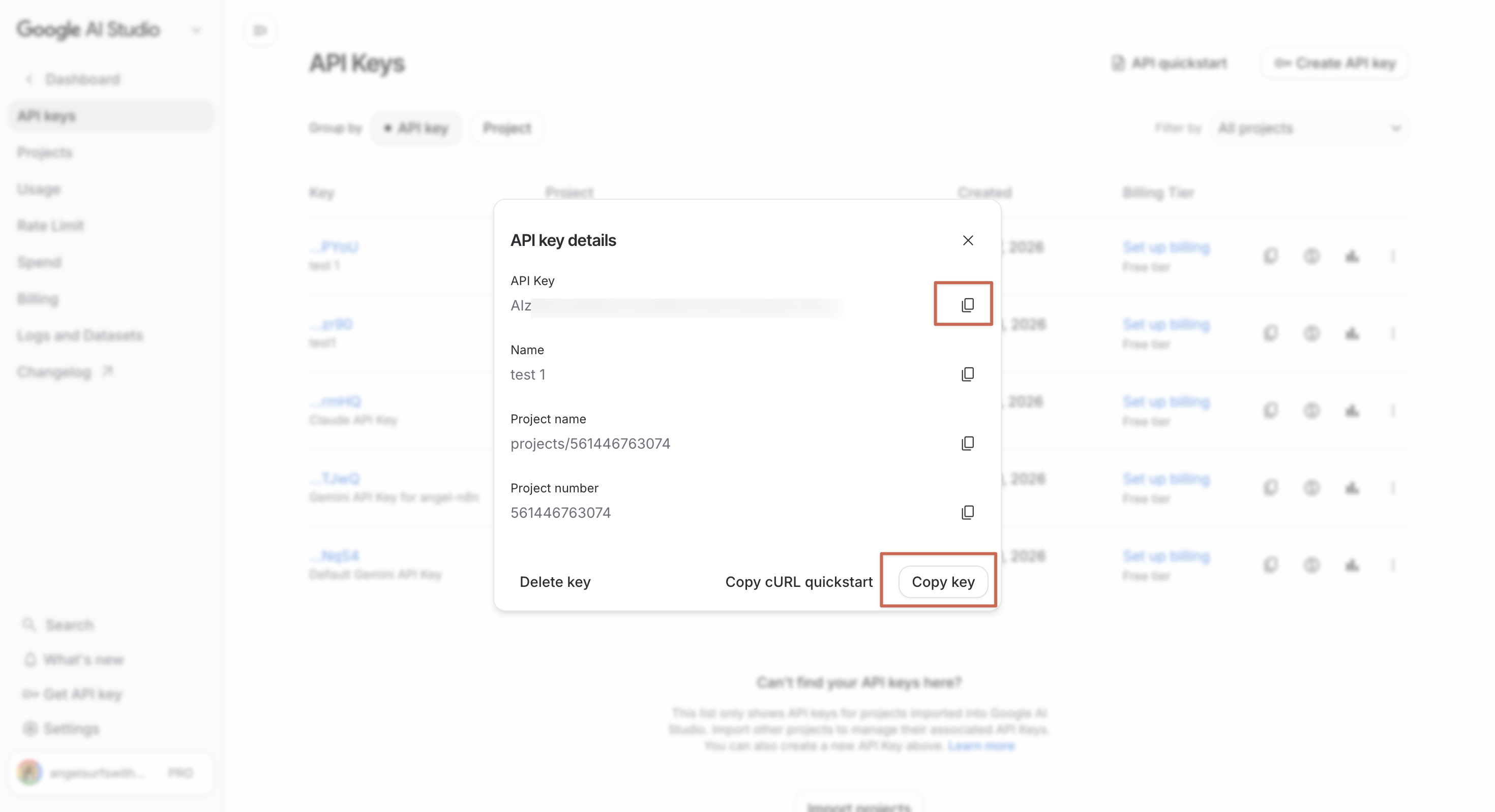 不小心關掉視窗也沒關係——剛剛建的 test 1 還是會留在畫面裡,按右邊的 Copy API key 一樣可以複製。